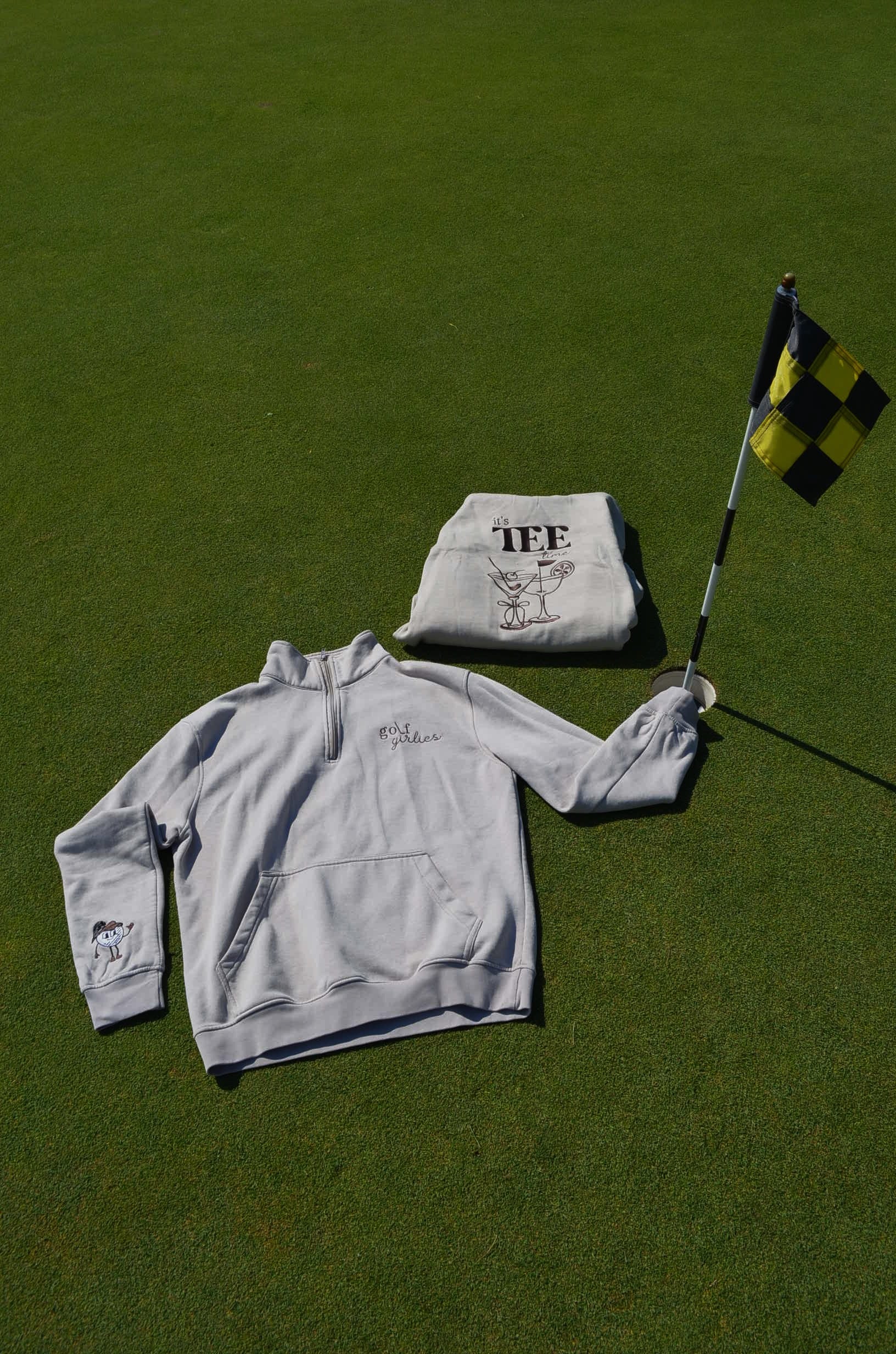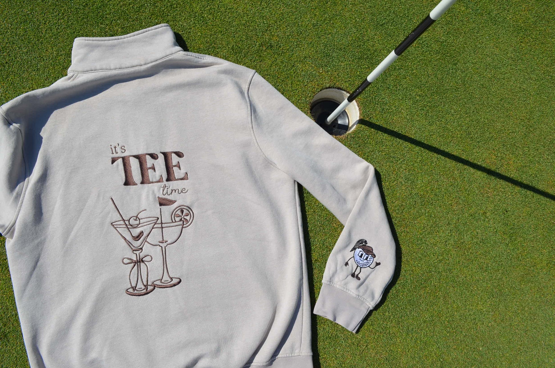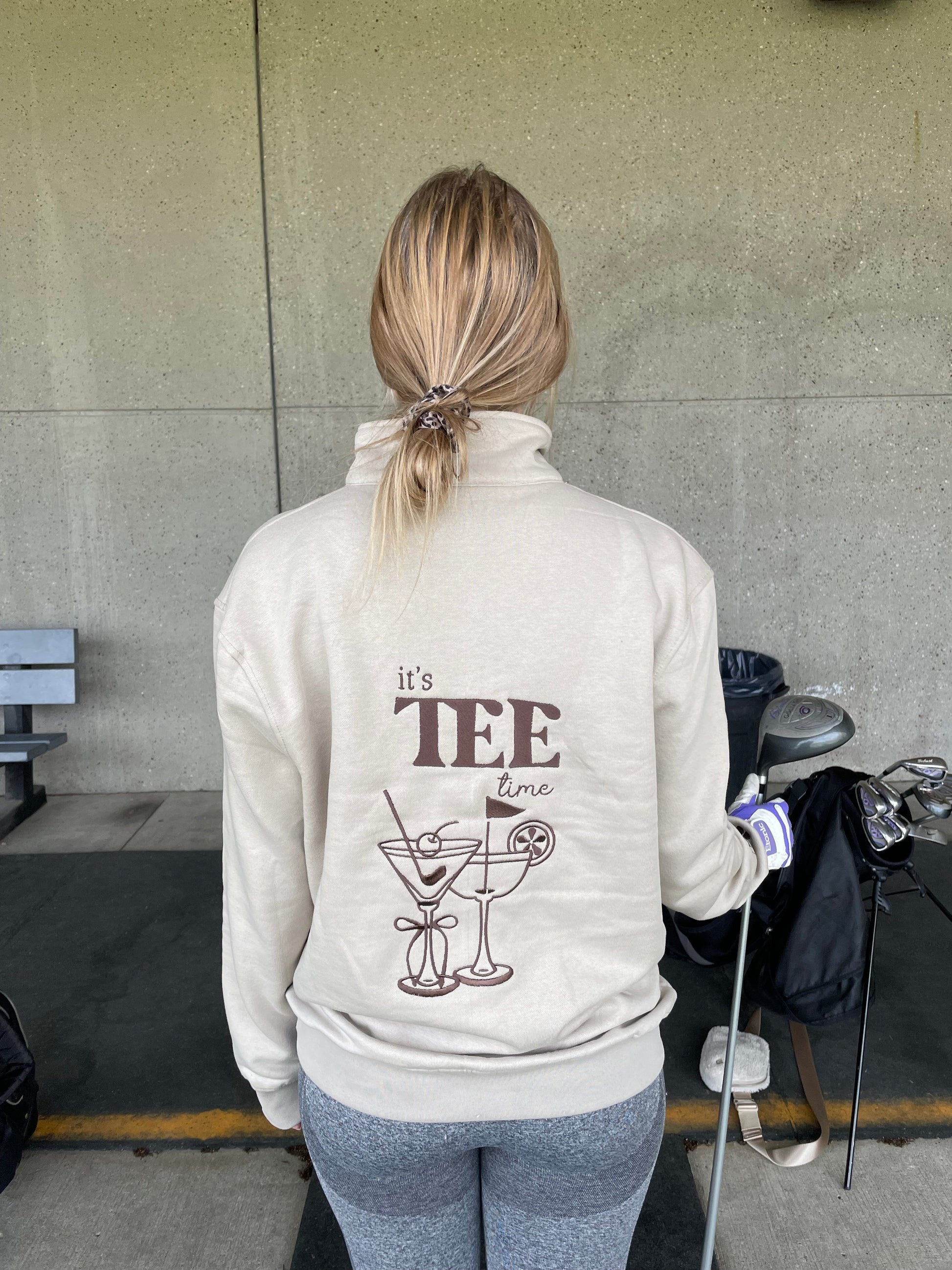 Meet the “it’s TEE time” 1/4 zip golf sweater in beige with brown accents, a stylish and practical choice for your next tee time. Crafted with attention to detail, it features brown embroidery and accents throughout. The highlight is the playful design on the back, featuring "It's TEE Time" with martini glasses adorned with golf accessories and a bow. The sleeve showcases an embroidered golf ball girlie with brown details. On the front, discover the Golf Girlie Collection logo with a hidden golf club. With a convenient 1/4 zip neck and a spacious front pocket, this sweater combines style and functionality for the perfect round on the green.