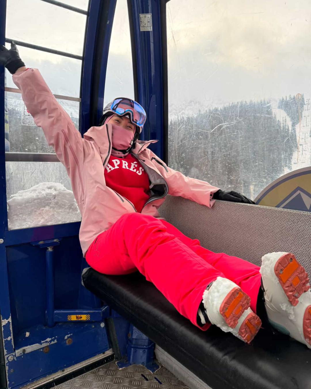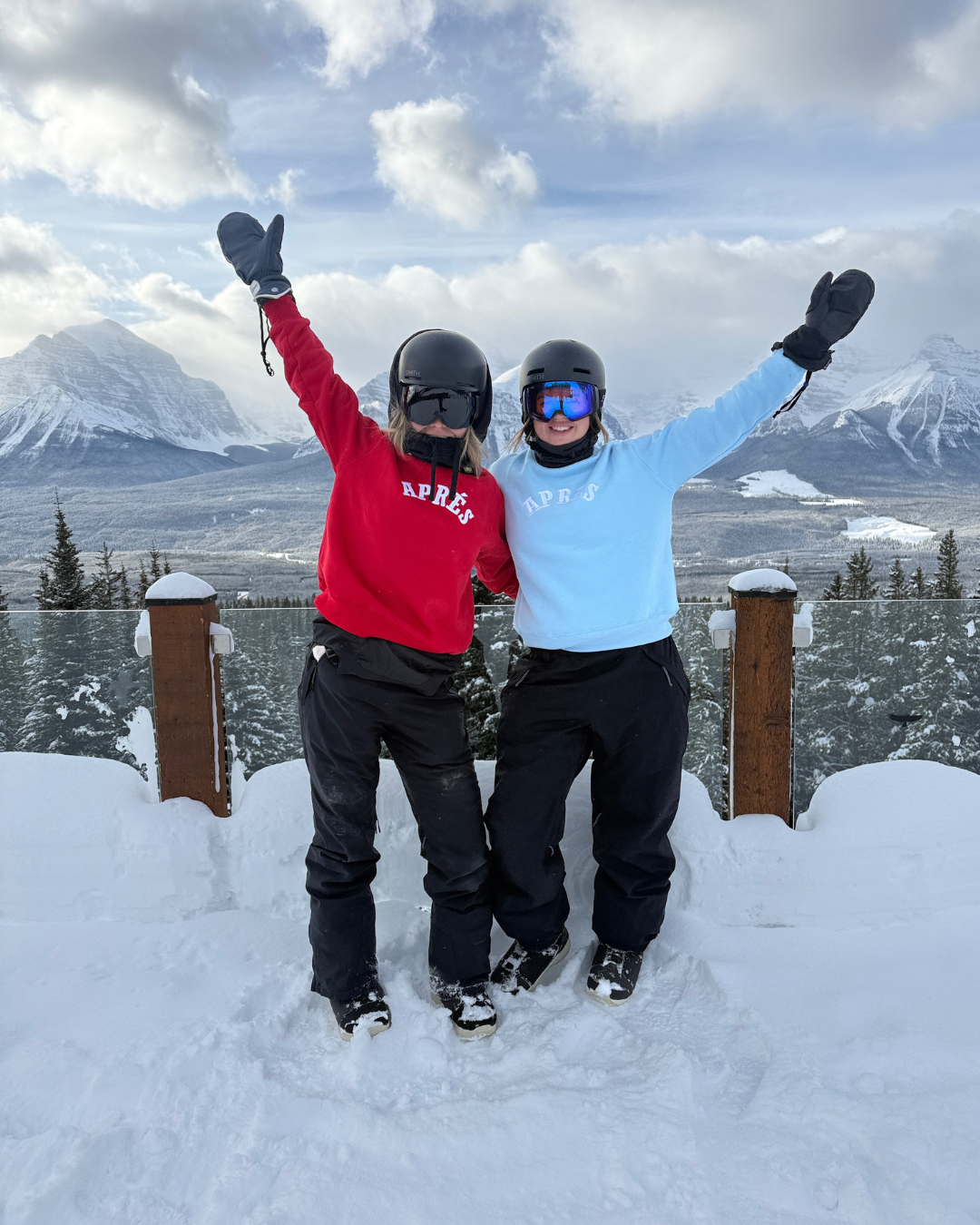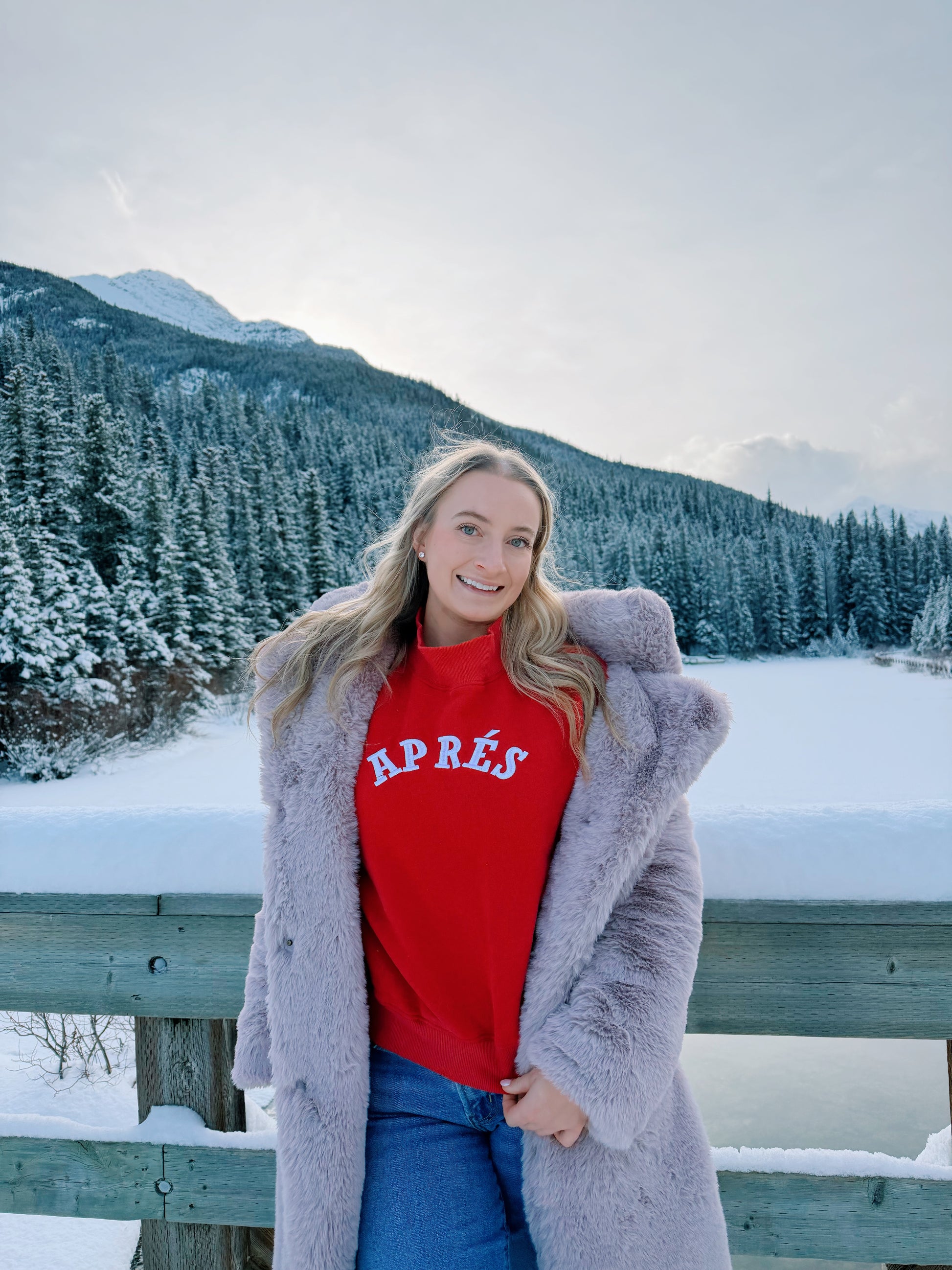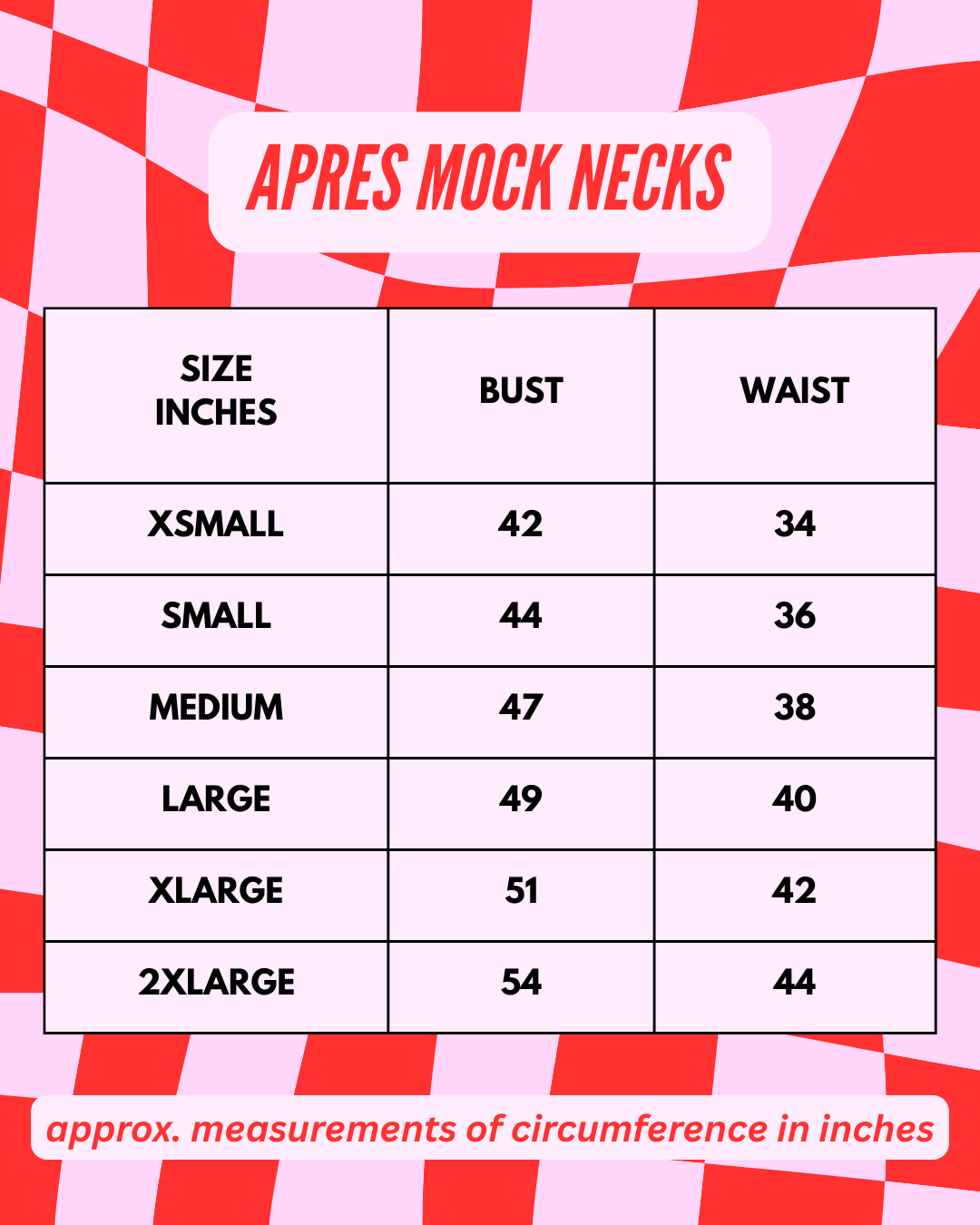 The One Too Many Après Mock Neck is a cozy women’s winter sweater available in cherry red or bubble blue with white text. Designed for après ski, skiing, golf layering, and everyday cold-weather outfits.
